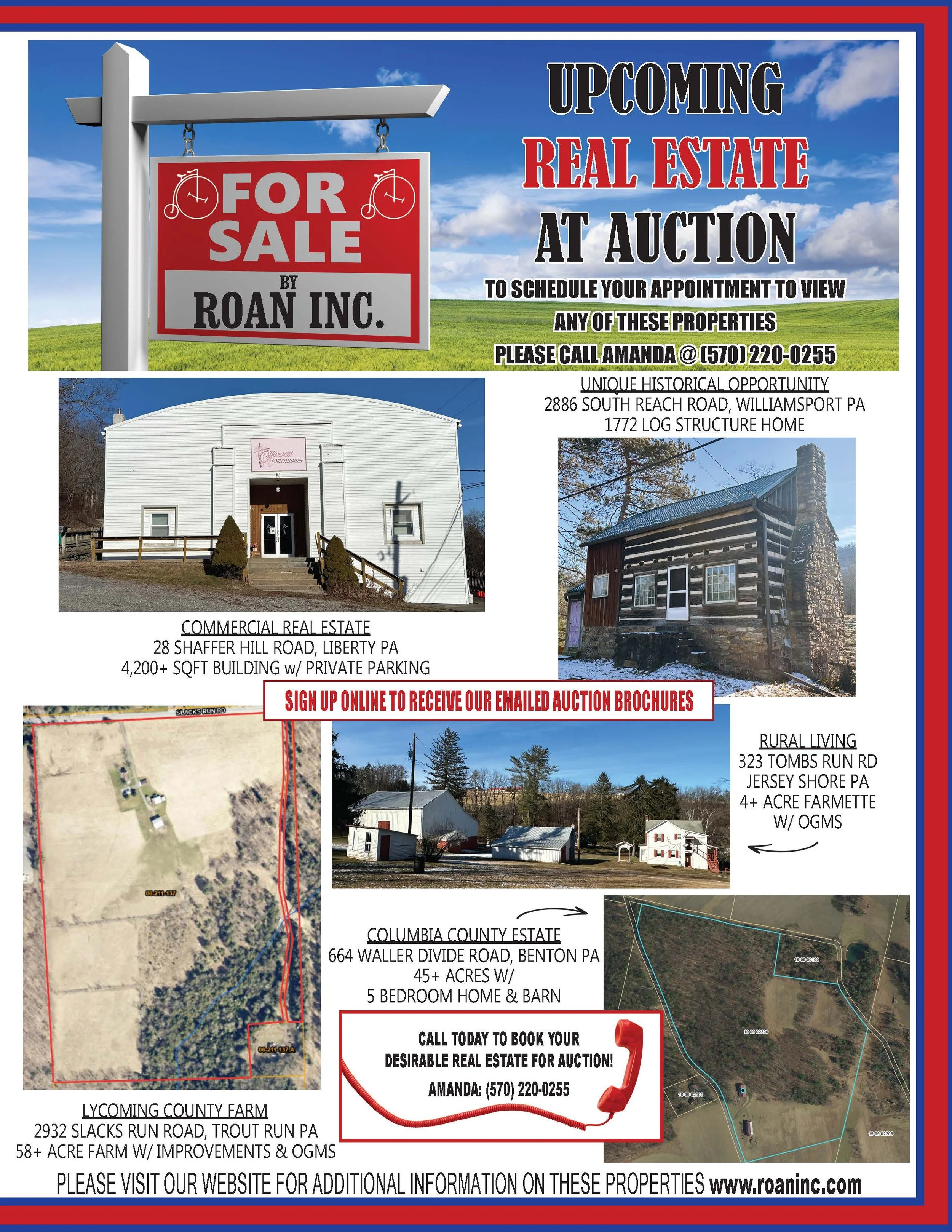 ROAN Inc. is a four generation family business proudly continuing the practice of selling real estate & contents at auction. We pride ourselves on carrying on the family tradition with an honest, straight-forward and fair business approach set forth by our late Grandfather Robert ‘Bob’ Roan and our late Father, Rich Roan. Established in 1945 we are a reputable company able to serve your auction needs.